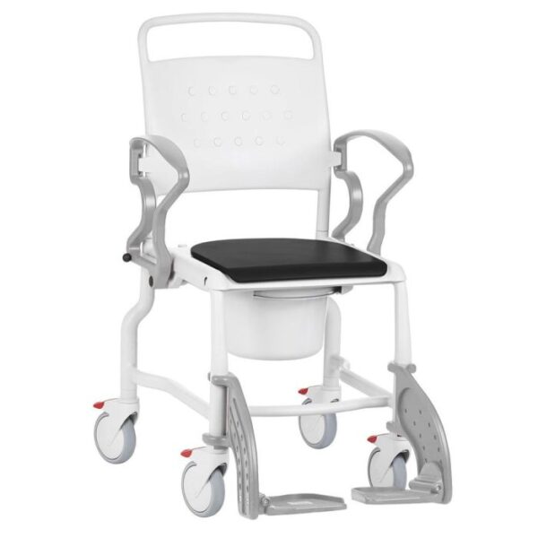 Rebotec Bonn Mobile Shower Commode Chair is a commode chair designed for care facility use as well as being perfect for home-care. Bonn is suitable for use as a bedside commode as well as over a toilet commode and in the shower. Polypropylene frame with long chain synthetic filler is warm and comfortable to touch. Strong and rigid modern materials with added benefit of shock dissipation with very high strength. No weld joints for rust or micro fracture weak points. Seamless joints where dirt and bodily fluids are not trapped. Locking, swing down arms for smooth, lateral transfer. Vulcanised synthetic rubber overeats. Seamless cushion, no upholstery.